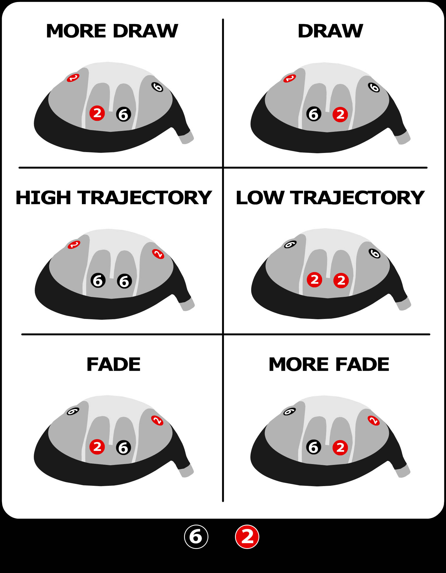 The driver includes two (2) six gram tungsten weights and two (2) four gram steel weights pre-installed. The position of the weights in the club head determine ball trajectory.